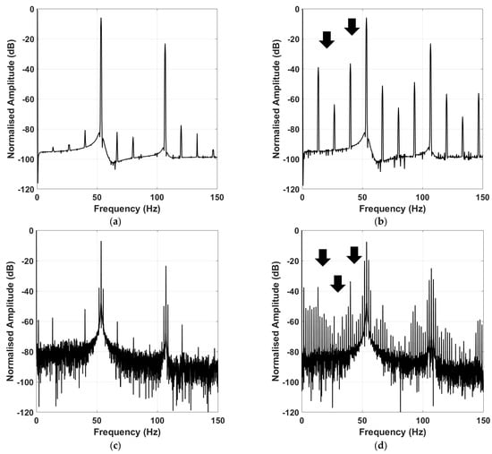 Figure 5a,b, respectively, depict the spectra of healthy and faulty loads at a nominal load. It was evident that, when demagnetization faults occurred, the amplitude difference could be as high as 20 dB—specifically with the ¾* fs, ½* fs, and ¼* fs harmonics components. Comparing experimental results, as in Figure 5c,d, to the simulation results, the other component visible in the spectra was deemed complementary because of the mechanical imbalance resulting from the removal of one single magnet module. The spectra for the different load instances are provided in Appendix F. Demagnetization had the same effect on those harmonics components as it did on the other.
