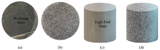 In this study, three types of shale samples were studied: Eagle Ford, Wolfcamp, and Mancos. Both uniaxial and Brazilian testing was conducted to evaluate the deformation and damage behavior of the rocks. The core specimens were prepared and tested employing ASTM D3967-08 for Brazilian Disc testing (BDT) and ASTM D 2938-95 for uniaxial compression testing (UCS) [31,32].