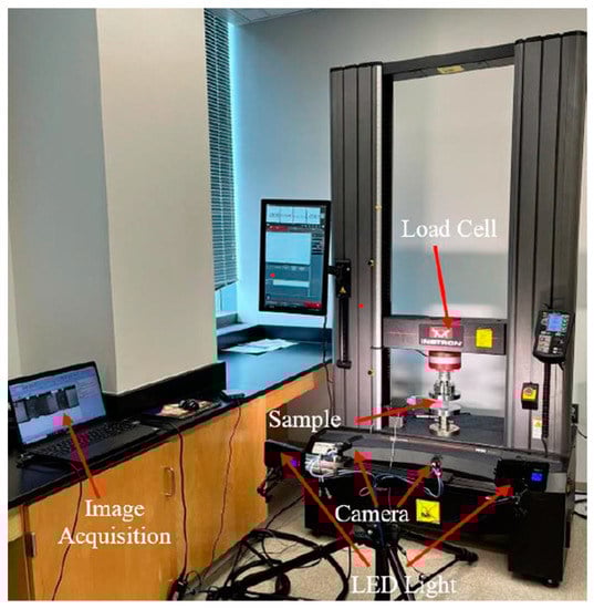 Samples were tested in a way similar to the testing conditions described by Nath et al. [7] for rock samples. To understand the DIC principles in detail, interested readers can go into the literature [33,34]. The Instron load frame was operated in displacement control mode with a displacement rate of 0.05 mm/min and an acquisition rate of 2 FPS. The image has a spatial resolution of 2448 × 2048 pixels, and the average length–pixel ratio of the imaging system is around 3.45 m/pixel. The detailed testing procedure is captured in Figure 2.