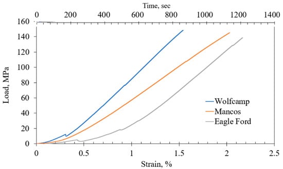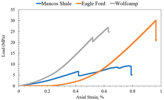 To analyze the evolution of deformation and damage characteristics in the tested shale specimens, a typical load–strain relationship is constructed using the data obtained from the Instron load frame based on both uniaxial and diametrical conditions. The load–strain curves for Eagle Ford, Wolfcamp, and Mancos shale specimens for UCS and BDT are shown in Figure 3 and Figure 4 respectively. Figure 3 shows that with equal load, the Eagle Ford shale specimen deforms more compared to the Wolfcamp and Mancos shale; this is likely due to the ductile nature of the shale.