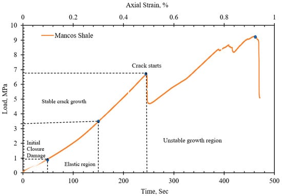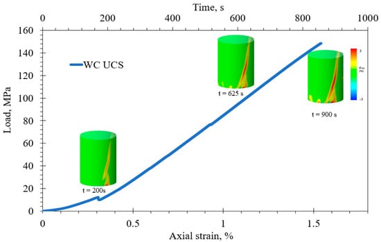 Figure 9 shows the results of a UCS test conducted on a sample of Wolfcamp shale, which reveals the presence of a distinct calcite vein. Damage can be tracked in the load–strain diagram at various stages as it develops in both the horizontal and vertical axes.