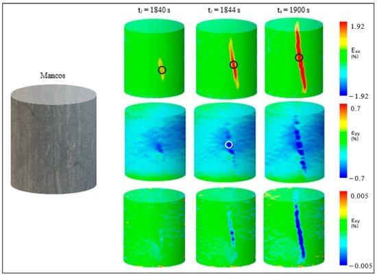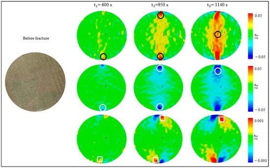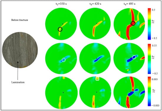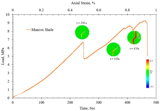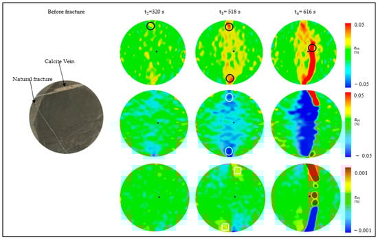 Figure 11 demonstrates the evolution of deformation and damage in Mancos shale in a similar fashion. The sample’s damage evolution shows strain accumulation along the vertical axis, which begins in the sample’s center (black and white circles). Then, as the load was increased, the fracture propagated outward along the centerline, indicating strain accumulation at the sample’s center. Mancos shale’s strain map differs from that of Eagle Ford shale in that the parallel propagation along the vertical axis is absent from the former. Furthermore, as seen in Figure 11, tension is more prominent than compression throughout the observed strain field.