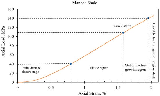 Figure 7 and Figure 8 show the stages involved in deformation and damage evolution during uniaxial and diametrical compression, respectively, where distinguishable changes occurred during loading. Based on the DIC map visualization, the whole damage process of the shale sample can be split into four distinct stages: the initial stage, the linear elastic region, the mixed elastic–plastic region, and the plastic stage where unstable fracture growth happened.