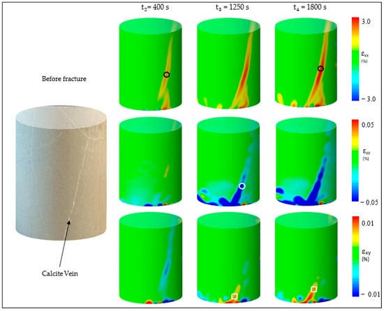 Initial strain development takes place on the existing vertical lamination in the sample, where the calcite vein is located. Because the greatest horizontal strain (εxx) occurs in the lamination’s center (black circle), cracks propagate down the vein of calcite. Vertical strain (εyy) is concentrated at the bottom of the sample through the calcite vein (white circle) and shear (εxy) strain (white rectangle) in the bottom loading end as a result of compressive load accumulation at the lamination. It was observed that the sample developed cracks in response to an increase in the load that was being applied to it. After the experiment, the crack matched the visible fracture’s path.