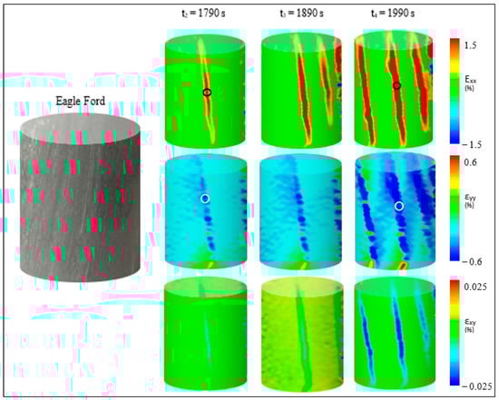 Figure 10 shows the evolution of the strain field and crack growth on the Eagle Ford shale sample during UCS testing. Initial cracking in the sample occurred midway between the horizontal and vertical axes (black and white circles, respectively), and the fracture progressed upwards as a result of strain accumulation. Increased strain causes not only vertical strain damage, but also strain and fractures in the sample. The lamination that is already present in the sample is reflected in the strain accumulation that can be seen in the vertical direction. Additionally, the strain field that was observed in Figure 10 demonstrates that tension is more prominent than compression in Eagle Ford shale.