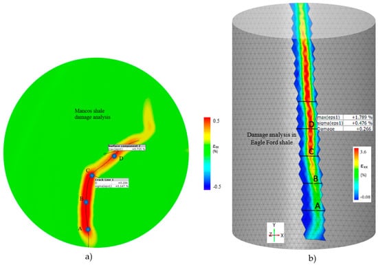 Analyses of these three different strain evolution maps in different time steps (t2, t3, and t4) can show the damage and failure nature in compression, tension, or shear. Finally, fracture initiation and propagation were observed until the failure of the samples. Figure 9 shows that the tension–compression mixed mode is dominant for damage that happened in the Wolfcamp shale.