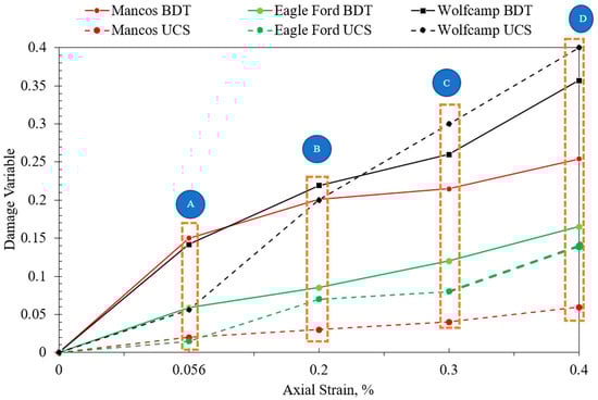 The damage variable is also illustrated in Figure 16. The damage process of the shale samples can be split into four distinct damage phases: initial closure stage, linear stage, elastic–plastic damage stage, and plastic damage stage, corresponding to the load–strain curves. At point A, initial damage reaches the closure stage where micropores in the sample are progressively compacted. Point B is the determinative and key point, from where internal to external changes occur during damage evolution; after this point, the sample damage reaches the visible scale. It is evident from Figure 16 that the damage variables obtained for all shale samples mostly follow a similar trend, though variables obtained during BDT are relatively greater than in UCS testing. A similar damage variable trend was observed in a UCS analysis on laboratory-made rock-like samples conducted by Chai et al. [25].