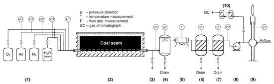 Scheme of the ex situ UCG installation [48]: (1) reagent supply system, (2) gasification reactor, (3) connection for tar sampling, (4) water scrubber, (5) air cooler for process gas, (6,7) gas separators, (8) centrifugal suction fan, (9) thermal combustor, and (10) gas purification module for GC analysis.