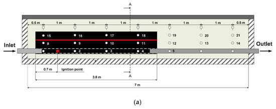 The main element of this installation is a reactor in which gasification can be carried out in a simulated coal seam, with a maximum length of 7.0 m and a cross-section of 1.0 × 1.0 m. This reactor enables coal gasification at temperatures of up to 1600 °C and an overpressure of no more than 0.5 bar. The gasifying agent can be oxygen, air, water vapour, or mixtures of these gases. Nitrogen is used for inerting the installation and for cooling the reactor after the gasification process is complete. To quickly remove the volatile gasification products from the reaction zone, the installation is equipped with a suction fan (Figure 1). By reducing the residence time of the volatile products in the reactor, the risk of a partial combustion of the flammable components of the process gas in the oxygen stream is reduced, and the possibility of secondary reactions in the produced tar is limited. To prevent the air from being sucked into the reactor by the suction fan, the gasification process is carried out with a minimum overpressure of 5–10 hPa. The pressure sensors are located at the inlet and outlet of the reactor, and in the wet scrubber. The hot process gas coming out of the reactor passes through a scrubber, inside of which, water is sprayed. This quickly cools the gas and removes the tar. The further purification of the gas takes place after the gas passes through the air cooler, separators of moisture, oil–tar substances, and solid particles. The cleaned gas is utilised by burning it in a thermal combustor. Before this combustion, part of the gas stream is taken for a chemical analysis, where the concentrations of hydrogen, carbon monoxide, carbon dioxide, methane, ethane, and hydrogen sulfide are determined with a gas chromatograph. The arrangement of the thermocouples in the reactor is shown in Figure 2a,c. The white circles that are shown in Figure 2a indicate the places that are constructively designed for the thermocouples, while the numbers next to the circles indicate the thermocouples that were actually used in this process (18 thermocouples). The first row of the thermocouples (T2–T5) was located at the level of the fire channel, at a distance of 0.2 m from the bottom of the reactor. The second and third rows of the thermocouples (T8–T14 and T15–T21) were located higher up, at every 0.25 m increment. Thermocouple T1, which was located closest to the oxygen inlet, had to be removed due to its unfavourable placement relative to the feed pipe. The pressure in the system was measured at the reactor inlet and outlet, as well as in the gas treatment and transport system for utilisation. The control and measurement apparatus recorded all the plant operation data every 10 s. The obtained results were recalculated to standard conditions (T = 273.15 K, p = 1013.25 hPa).