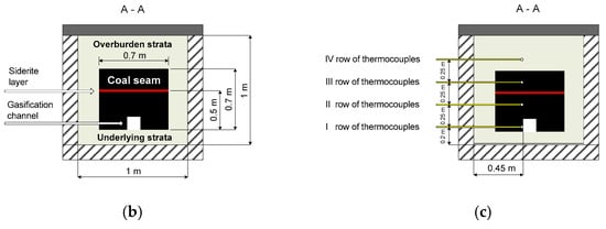 Details of the reactor construction [48]: (a) longitudinal cross-section—arrangement of coal seam and thermocouples position, (b,c) cross-section: dimensions of the coal seam and thermocouples distances.