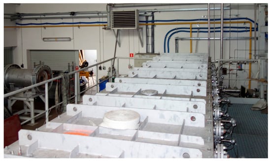 The coal that was subjected to gasification came from the Piast mine, located in the south of Poland (Upper Silesian region). The dimensions of the gasified coal block were 3.8 × 0.7 × 0.7 m (width, depth, and height). The upper part of the block of coal was cut horizontally at a height of 0.5 m, and a 2 cm thick layer of siderite was placed at the intersection. In the lower part of the block of coal, a fire channel with a cross-section of 0.1 × 0.1 m was cut out along its entire length. The gasification agent was supplied on one side of the channel, and the gaseous gasification products were led outside on the other side. The prepared coal block was placed inside the reactor on a 0.2 m thick wet sand layer. The free space between the coal block and the reactor side walls was also filled with wet sand. The sand was used as an insulating material, simulating moisture in the vicinity of the gasified coal seam. The weights of the coal, siderite, and wet sand that were used were 2300 kg, 150 kg, and 7900 kg, respectively.