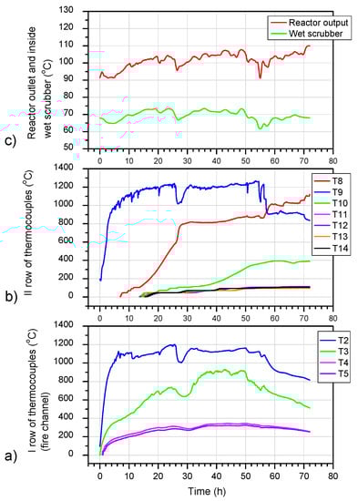 Temperature diagrams [48]: (a) row I of thermocouples (fire channel), (b) row II of thermocouples, and (c) reactor outlet and wet scrubber.