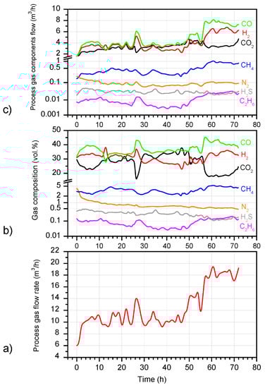 Figure 5a shows the process gas flow rate, and Figure 5b,c show the composition and the mass flow of the individual gas components. The data obtained in Figure 5a show that, from the beginning of the process until approximately 46 h, the flow of the gas received was relatively stable and was in the range of 10–14 m3/h. After 46 h of the process, the amount of gas produced began to increase, reaching a value of approximately 18 m3/h. The total amount of the gas produced was 896.94 m3, with an average flow of 12.46 m3/h.