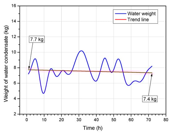 The lowest and highest amounts of the water produced, amounting to 4.7 kg and 10.2 kg, were recorded at 10 and 31 h of the process, respectively. The trend line for the changes in the amount of obtained water, shown in Figure 7, has a downwards trend, which indicates that, as the gasification progressed, the amount of water that was released decreased.