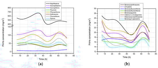 Figure 9a,b show the concentrations of the PAH compounds at high and low concentrations. The highest concentration of this group of compounds was characterised by naphthalene, acenaphtylene, and phenanthrene. Their average concentrations in the process gas were 522.9, 110.7, and 91.6 mg/m3, respectively.