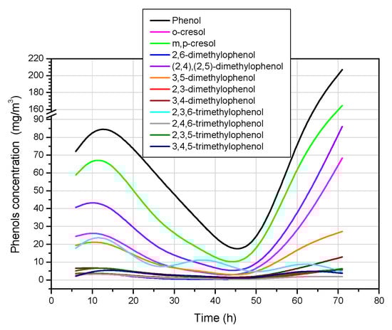 Phenols, whose concentrations are shown in Figure 10, are the third group of the compounds that were tested. In this group of compounds, the highest average concentration was characterised by phenol (69.1 mg/m3), followed in decreasing order by m,p-cresol (48.2 mg/m3) and (2,4),(2,5)-dimethylphenol (26.9 mg/m3). The concentrations of the remaining compounds in this group were significantly lower (Table 4).