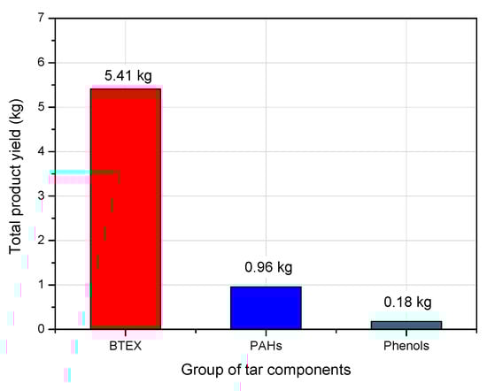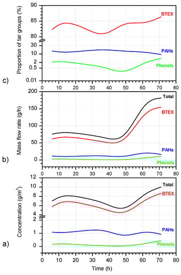 Based on the results that were obtained, the concentrations of the individual compounds in the groups were summed and presented as total concentrations of the BTEX, PAHs, and phenols. The mass flow of these groups in the process gas and their mutual proportions were also calculated. The results that were obtained are presented in Figure 11a–c.