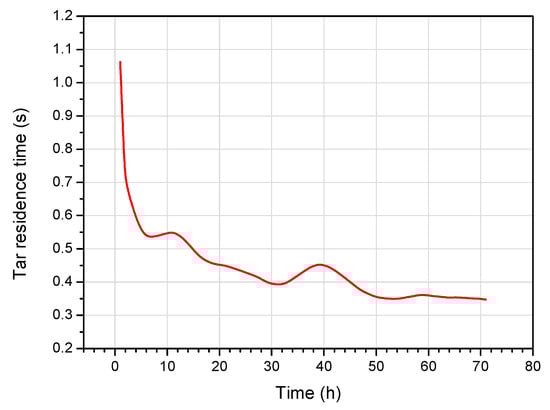 Figure 12 shows that, at the beginning of the experiment, the residence time of the tar in the reactor was approximately 1 s, and at the end, it was 0.35 s. This means that there was a threefold decrease as the reaction progressed. The visible local increases in the residence time at approximately 10 h and 40 h of the process are due to the lower amount of water released at these times (Figure 7).