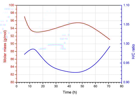 Figure 13 shows that the changes in molar mass and H/C ratio were inversely proportional to each other. An increase in the molecular weight of the tar corresponded to a decrease in the H/C ratio, and vice versa. This validates the analysis and calculations, because the lighter the tar was, the higher the H/C ratio. Figure 13 shows that, at the beginning of the process until approximately 15 h, the molar mass of the tar decreased from a value of approximately 97 g/mol to 93 g/mol. At the same time, the H/C ratio increased from 0.97 to 0.99. Then, by the 46th hour, the molar mass began to increase, and the H/C ratio began to decrease. At the 46th hour of the process, the molar mass was 95.5 g/mol and the H/C ratio was 0.93. From this point in time until the end of the experiment, the molar mass began to decrease to a value of 91.1 g/mol, and the H/C ratio steadily increased to a final value of 0.99.