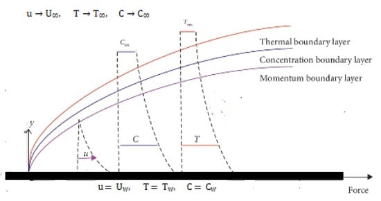 For their research, Rashidi et al. [15] analyzed MHD mixed convective heat transfer in an incompressible viscoelastic fluid flowing via a permeable wedge with thermal radiation. As opposed to this, Bhattacharyya et al. [16] specifically mentioned the impact of thermal radiation on micropolar fluid flow and heat transmission through a contracting porous surface. The influence of temperature-dependent viscosity on free convective flow across a vertical porous plate was first determined numerically by Makinde and Ogulu [17]. In this study, we considered the effects of a magnetic field, heat radiation, and a homogeneous chemical process of the first order. Hayat et al. [18] were able to determine how Joule heating affected the flow of a third-grade fluid across a radiative surface. The influence of thermal radiation and viscous dissipation on the flow of nanofluids in a boundary layer towards a permeable moving flat plate was the subject of computational research conducted by Motsumi and Makinde [19]. Makinde [20] focused heavily on the hydromagnetic mixed convection heat and mass transfer flow of an incompressible Boussinesq fluid across a perforated surface with fixed heat flux and energy emissions. Shahzad et al. [21] calculated the three-dimensional motion of an Oldroyd-B fluid subject to heat radiation.