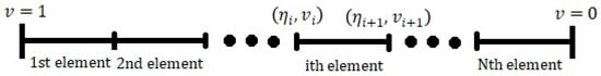 Equations (7)–(10) are solved using a numerical technique based on the Galerkin finite element method. To apply this method for a reduced system of Equations (7)–(10), the whole infinite domain is considered to be finite, . Divide this entire domain into a finite number of subdomains known as finite elements. Since there is only one independent variable in the problem, each element is a line segment with two nodes at both ends. Let and are two nodal coordinates at the left and right node of element, respectively. The nodal variables and are nodal variables assigned to the left and right nodes of element, respectively. Let the length of each element be denoted by . The trial function, which is linear polynomials, is expressed as: