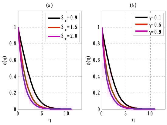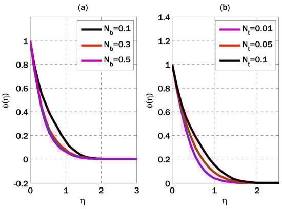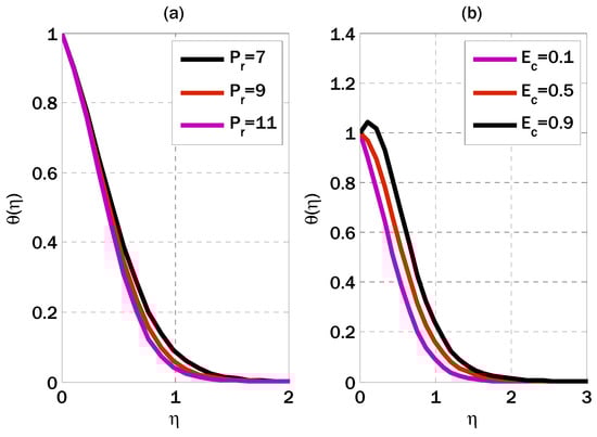 Figure 3 shows the Wiesenberg number and electric parameter variation on the velocity profile. Velocity decreases by incrementing the Wiesenberg number and grows by enhancing the electric parameter. The growth in the Wiesenberg number is responsible for decreasing the fluid’s viscosity, which leads to enhancement in the resistance of the deformation in the fluid flow; therefore velocity profile decays. Figure 4 shows the effect of the Eckert number and Prandtl number on the temperature profile. The temperature profile rises and decays by enhancing the Eckert and Prandtl numbers, respectively. The temperature profile growth results from an increment in the transformation of work into heat. The escalation in the Prandtl number also produces decay in the thermal diffusivity; consequently, thermal conductivity reduces, and the temperature profile falls. The effect of thermophoresis and Brownian motion parameters on the temperature profile is depicted in Figure 5. The temperature profile is boosted by rising thermophoresis and Brownian motion parameters. Since the hot particles get scattered in the fluid due to an upsurge of random movement, the temperature profile accelerates. The increment in the thermophoresis parameter yields growth in the cycle of shifting particles from the plate to its vicinity, thus increasing temperature profile upturns. Figure 6 illustrates the consequence of the Schmidt number and dimensionless rate parameter in the concentration profile. Temperature profile declines by accumulating Schmidt numbers and dimensionless reaction rate parameters. The augmentation in the Schmidt number offers a decline in mass diffusivity and, consequently, concentration profile falloffs. Since breaking or forming chemical bonds between atoms intensifies due to the augmentation of reaction rate parameters, the concentration profile declines. Figure 7 demonstrates the influence of thermophoresis and Brownian motion parameters on the concentration profile. Concentration profile falloffs and augments by aggregating the thermophoresis and Brownian motion parameters, respectively. Since increments in the Brownian motion, the parameter brings the particles to their vicinity, so particles of concentration also spread randomly, and consequently, the concentration profile rises.