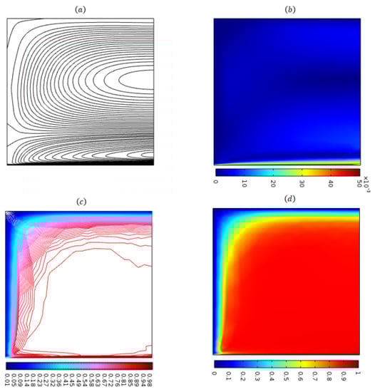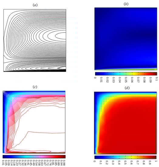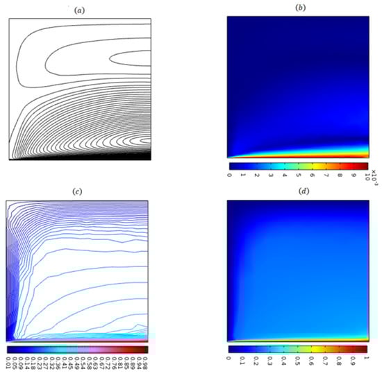 (a) Surface plot of velocity, (b) streamlines, (c) surface plot of temperature, and (d) isothermal contours using .