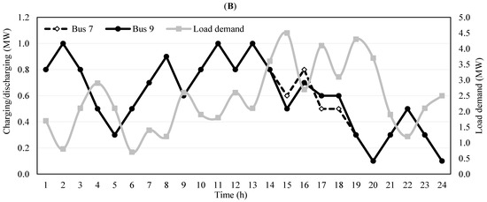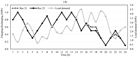 | Charging/discharging decisions of ESSs (1 = allowed, 0 = not allowed) | |
