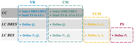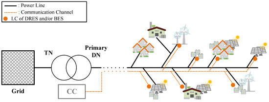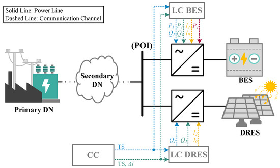 - Central controller (CC) layer: The CC is employed to coordinate the operation of DRES/BES units via their local controllers (LCs) by sending control signals in case of voltage violation and/or current overload events. The CC coordination concept is depicted in Figure 2 and Figure 3 for the primary and the secondary DN, respectively.