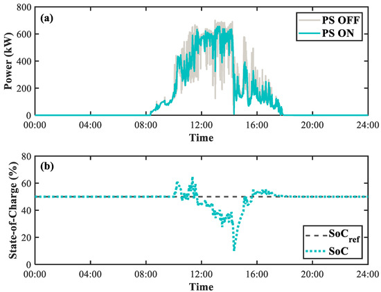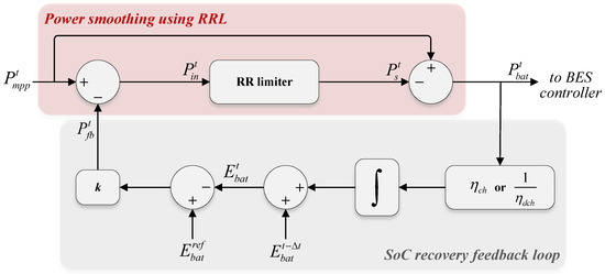 To compensate the DRES power fluctuations, the generic PS scheme [16,17] of Figure 4 is adopted. It consists of a ramp-rate limitation (RRL) algorithm and a state-of-charge () recovery mechanism. The target of the RRL control is to maintain the ramp rate, , of the generated at MPP PV output power, , within specific minimum, , and maximum, , limits. The former is introduced to limit ramp-downs, i.e., negative ramp rates caused by the reduction in the DRES output power, and the latter to limit ramp-ups, i.e., positive ramp rates due to the increase of the DRES output power. The at time instant t in W/s is defined as