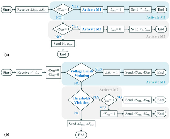 An event-triggered VR strategy is proposed to solve overvoltage and undervoltage issues. The proposed VR is based on the coordinated operation of the CC and the DRES/BES LCs as depicted in the flowcharts of Figure 5. In particular, the DRES/BES LCs communicate on a regular basis with the CC and transmit their measured at POI positive-sequence voltage, and an auxiliary binary variable (See Figure 5a). From the obtained data, the CC identifies the nodes exceeding (assuming network overvoltage) and activates the VR algorithm at the LC node, presenting the maximum overvoltage by sending appropriate activation signals (See Figure 5b).