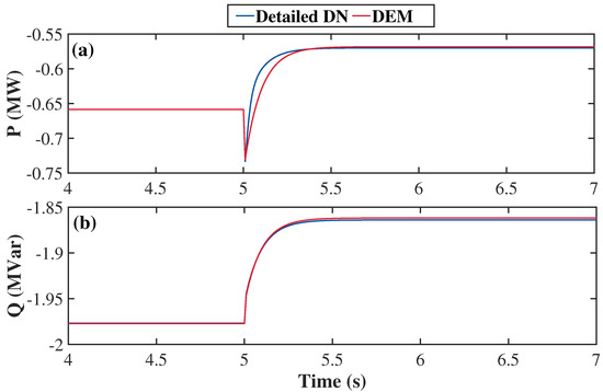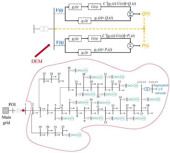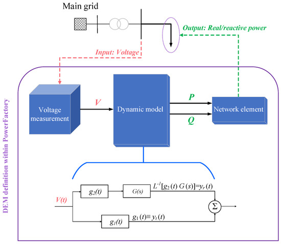 DEMs describe the aggregated real and reactive power response of a system bus following a voltage disturbance. This way, DSOs can derive reduced, equivalent models of their own networks and couple them to the TN model for use by the TSO. The concept and the structure of the proposed DEM is depicted in Figure 6. The adopted equivalent model has the form of (15)–(19) [10]