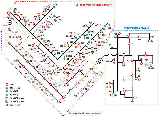 For the evaluation of the performance of the designed AS and the dynamic analysis applications simulations are conducted using the T&D network of Figure 7. The T&D power system consists of a high voltage (HV) TN, as well as of a primary medium voltage (MV) and a secondary low voltage (LV) DN. The TN and primary and secondary DNs are modified versions of the IEEE 39 Bus Test System [23], the 12.66 kV IEEE 33 Bus Test System [24] and the unbalanced three-phase IEEE European LV test feeder [25], respectively.