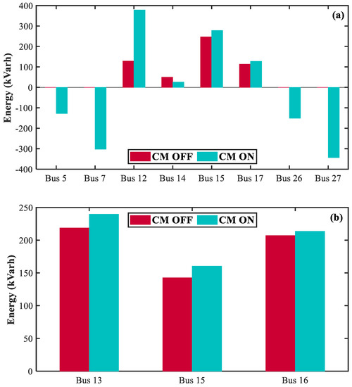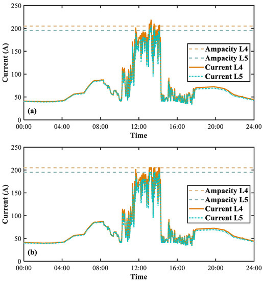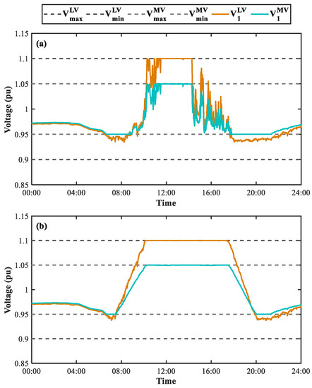 Indicative rms positive-sequence voltage profiles of the primary and the secondary DN buses 17 and 652, respectively, are presented in Figure 8. Results are depicted separately for the cloudy and the sunny days, i.e., Figure 8a,b. It can be seen that by using the proposed VR scheme the voltage levels are successfully maintained within the prescribed voltage limits for both DNs. Comparing Figure 8a and Figure 8b, it can be realized that overvoltages are more prone to occur during a sunny day than during a cloudy day, starting at 10:08 and last up to 17:27. The same remarks can be also deduced by analyzing the voltage profiles of all DN buses.