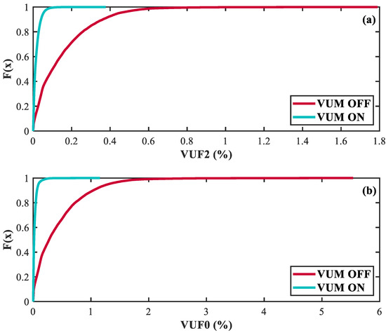 The efficiency of the VUM AS is investigated in Figure 9 by means of cumulative distribution function plots of the zero- (VUF0) and the negative-sequence (VUF2) voltage unbalance factors. VUF0 and VUF2 are defined as the ratio of the zero-, negative-voltage to the corresponding positive-sequence voltage component. The cumulative distribution functions are derived by analyzing the rms voltages of all secondary DN buses and refer to the cloudy day case; similar cumulative distribution functions are also derived for the sunny day. The VUF0 (Figure 9a) and VUF2 (Figure 9b) results are evaluated by assuming VUM ON and OFF. It can be seen that by absorbing zero- and negative-sequence currents in terms of the proposed scheme the voltage asymmetries are reduced (VUF0 is below 2% and VUF2 below 0.8%). This is achieved by compensating locally the zero- and negative-sequence currents, thus reducing the corresponding voltage sequence drop along the lines and eventually mitigating the bus voltage asymmetries, in particular, absorbing the zero-sequence current results into a neutral point shift toward zero and consequently to the mitigation of the zero-sequence voltage asymmetry [31]. For VUM OFF, VUF0 can reach 6%, while VUF2 is below 1.2%. It should be indicated that for VUF2, a limit of 2% is prescribed by the IEEE 1547 Std. [32].