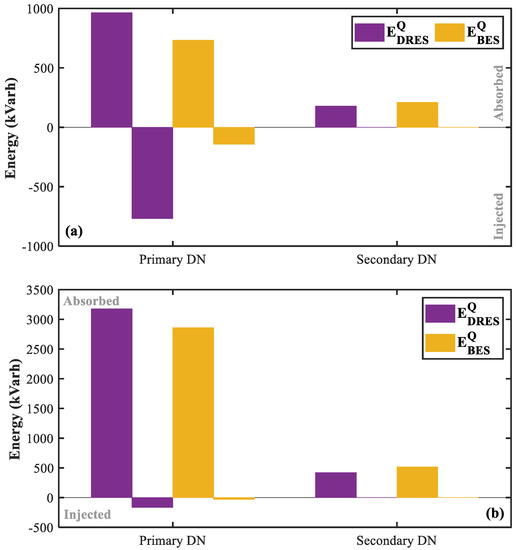 In both scenarios, the permissible voltage range for the primary DN is within 0.95–1.05 pu and for the secondary DN 0.9–1.1 pu.