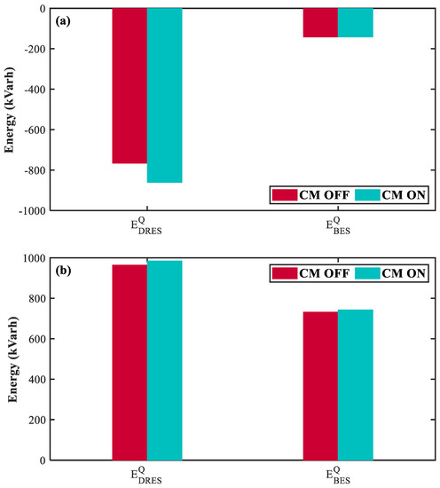 where and denote the symmetrical component output currents and POI voltages of the DRES/BES converter (see Figure 3), respectively. By setting the non-diagonal elements of equal to zero, it is evident that the symmetrical components are decoupled, rendering feasible the individual control of the symmetrical component currents [14]. It must be also indicated that in order to compensate the voltage unbalance, only the reactive capability of the converter is exploited by means of and , leaving intact the output active power of both DRES and BES. Finally, is determined by the outputs of the VR strategy analyzed in Section 2.4.