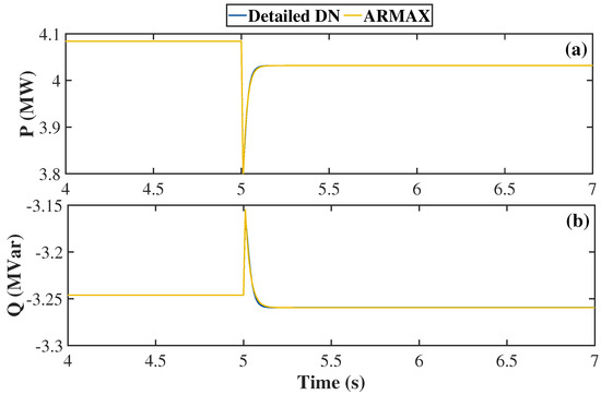 Here, denotes either the real or the reactive power response and is the corresponding transfer function with parameters of order and of order . The real/reactive power model parameters are calculated via ARMAX modeling by using a voltage disturbance response as input and the power response as output, respectively. Coefficients , and , are determined from the overshoot and the new steady-state points, respectively. The optimal order of is determined similarly to Step 1 of mode estimation [10].