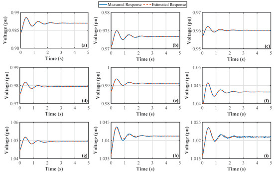 Voltage magnitude responses (in pu). Figure (a–i) refer to different PMUs, i.e., to different locations/buses of the examined setup. Further information concerning the exact location of the PMUs are provided in [38].