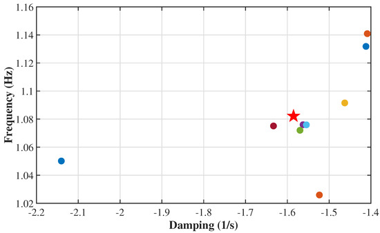 Identified modal parameters. Colorful dots denote modal estimates, resulted from single-signal analysis, i.e., by analyzing separately the available signals. The red star denotes the estimate resulted by the proposed multi-channel clustering-based approach.