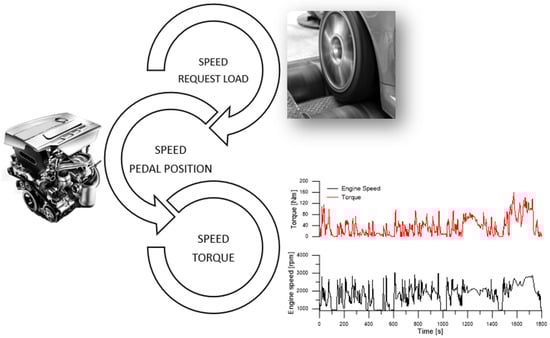 For this purpose, a specific procedure was developed, as schematically shown in Figure 2. The WLTC was reproduced on the roller test bench (RTB) by using a vehicle equipped with the same engine with the aim of collecting the engine speed and the request load. These data were used to reproduce the WLTC on the ETB by setting the pedal position with a feedback on the request load to reach the same values read on the RTB. During the WLTC realized at the ETB with gasoline, assumed as a reference fuel, the brake torque was recorded and then used to reproduce the WLTC at the ETB with the reference fuel by adjusting the pedal position with a closed loop control on the actual brake.