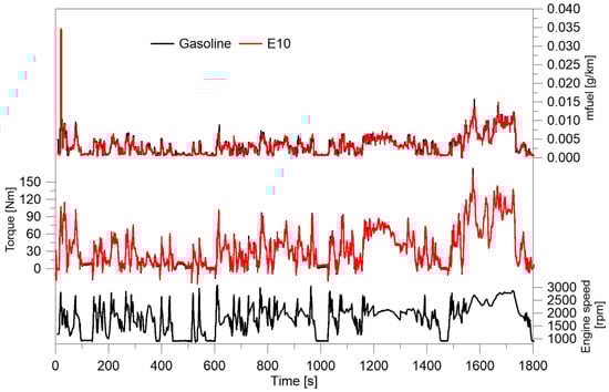 Figure 3 shows the temporal evolution of the instantaneous fuel consumption, engine torque and speed over the WLTC for gasoline and E10. The engine torque follows the same patterns for the tested fuels. As described in the previous section, the procedure to realize the WLTC at the engine test bench was developed so that the torque output was fixed, regardless of the fuel used. On the other hand, to reach the same torque output, the instantaneous fuel consumption changed depending on the fuel properties. However, it is possible to identify similar characteristics during the cycle among the fuels. A high fuel consumption, in fact, is observed in the first minutes of the cycle, where fuel enrichment is required to face the low temperature of the cold start. A peak of 0.015 g/km was measured for gasoline, while higher value, up to 0.03 g/km, was detected for E10. Due to the higher HOV of the ethanol blend, a larger amount of fuel was in fact injected to overcome the cold engine start. A large fuel consumption was also measured in the extra-high phase of the cycle where more fuel is required to realize the strong accelerations. Similar values, up to 0.016 g/km, were measured for both fuels. In this case, thanks to the higher temperature reached in the combustion chamber, the effect of ethanol blend properties is less evident.