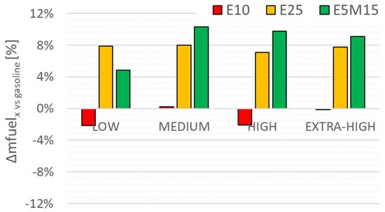 To obtain a better analysis of the impact of the fuel, the consumption variation for the alcohol blends with respect to gasoline fuel was calculated at each phase of the cycle and is shown in Figure 4. It can be observed that there are no significant differences between the consumption of gasoline and E10 (all are within 2%). E25, and even more so E5M15, show a higher fuel consumption than gasoline fuel because of the lower LHV. A peculiar behavior is observed in the low phase where the fuel consumption of E5M15 is higher than that of gasoline fuel but slightly lower than that of E25. A possible reason is that the ECU performs a correction when the methanol blend is used to avoid a strong reduction in temperature caused by the higher HOV of methanol, especially in the first minutes of the cycle when the temperature is already low.