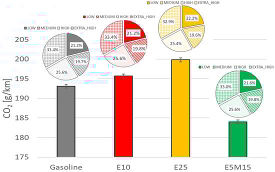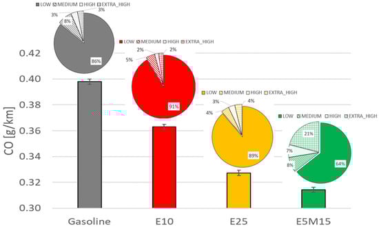 Figure 5 reports the CO2 emissions. It is known from literature [22] that CO2 emissions depend on the fuel consumption and the combustion efficiency. As shown in Figure 4, the amount of fuel undergoes a slight reduction from low to medium phase and a following increase in the high and extra-high phases. The same trend of CO2 emissions is observed for all the fuels. Regarding the fuel effect, the CO2 emissions increase with the ethanol content in the blend. The oxygen content in the alcohol fuel, in fact, guarantees a “premixed oxygen effect” [23], thus allowing a more complete combustion. A strong reduction is observed for the ternary blend, although it is characterized by higher fuel consumption. This result can be ascribed to the lower C-content of E5M15. Moreover, an important role is played by the stronger charge cooling effect of the methanol blend that leads to a worst fuel evaporation and combustion efficiency compared to gasoline and ethanol blends.