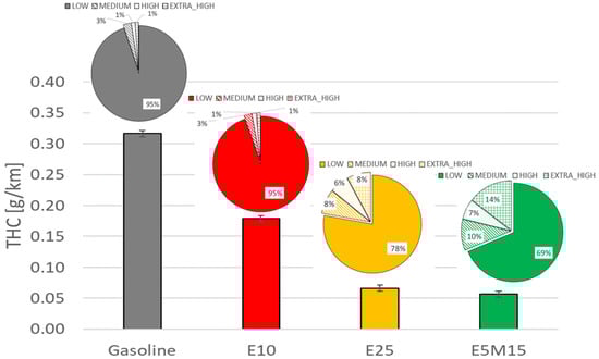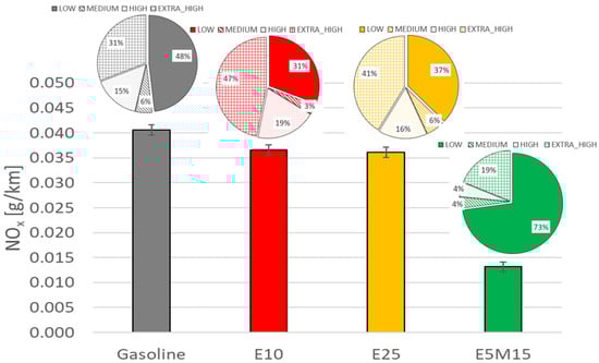 Figure 8 illustrates the NOx emissions detected for the tested fuels. It is well known that the NOx formation reactions depend on the oxygen availability and the combustion temperature. In this case, it is not possible to observe a common trend in the proportion of NOx emitted among the different phases of the cycle. This is ascribable to the different role of the cooling effect and the oxygen content for each of the fuels. Regarding the binary blends, the total NOx emitted during the WLTC decreases for E10 and even more so for E25 with respect to gasoline fuel because of the stronger cooling effect as a result of the higher HOV. In the low phase, the lower NOx emissions compared to gasoline are due to the higher HOV of ethanol that contributes to a further reduction in the temperature in the first minutes of the cycle, since more heat is required to vaporize the fuel. On the contrary, in the last phase of the cycle, characterized by a higher temperature, the larger oxygen presence plays a dominant role, resulting in a higher NOx formation. For E5M15, the charge cooling has a major effect during the entire cycle, thus resulting in lower NOx values at each phase.