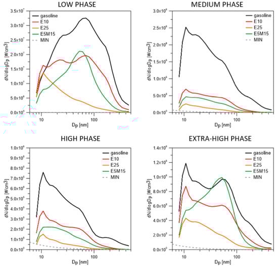 The effect of alcohol blends on the particle emissions was also analyzed. Figure 9 depicts the PSDs averaged over each phase of the cycle for gasoline, E10 [25], E25 and E5M15, and the minimum concentration limits for each diameter (MIN). Particles have diameters ranging between 10 and 300 nm and the shape of the PSDs varies with the fuels and the specific phase of the cycle.