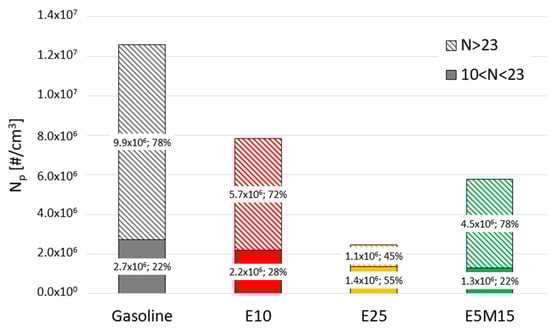 Figure 10 depicts the total particle number emitted throughout the cycle with particles classed as those with a size larger than 23 nm, representative of accumulation particles, and those smaller than 23 nm, whose measurement has been the subject of several research studies because of their regulation from the next emission standard [28,29,30,31]. Gasoline fuel emits a total of 1.3 × 107 #/cm3 particles, of which 78% are larger than 23 nm and the remaining 22% are sub-23 nm particles. As ethanol is added to the base fuel, the particle number decrease to 7.9 × 106 #/cm3 and 2.5 × 106 #/cm3 for E10 and E25, respectively. Moreover, the fraction of particles with a diameter lower than 23 nm is more considerable than gasoline fuel, reaching 28% with E10 and up to 55% with E25. As mentioned previously, ethanol has a lower propensity to form soot. Moreover, its presence affects the soot aggregate structure that becomes smaller and simpler and thus more prone to oxidization [32]. For E5M15, the total particle number remains lower than gasoline fuel, 5.8 × 106 #/cm3, even though it has a higher value with respect to E25 that is characterized by the same energy content as the ternary blend. By analyzing the particle dimensional range, it can be observed that the major contribution by the particles larger than 23 nm. As described above, when methanol is added to the blend, the cooling effect of the charge due to the higher HOV has a dominant role over the higher level of oxygen in the fuel, thus leading to incomplete mixture evaporation and, hence, poor mixture preparation.
