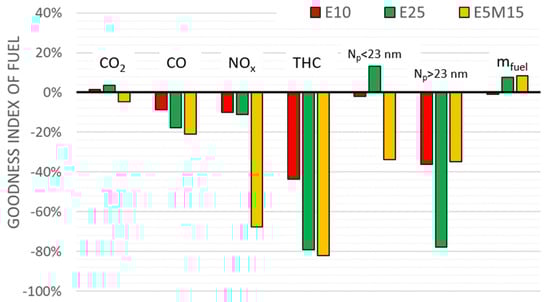 Goodness index based on fuel consumption and emissions for gasoline, E10, E25 and E5M15.