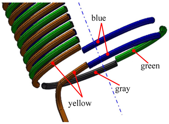 In the shielding induction motor test, the corresponding primary and secondary cooling water inlet temperature were set as 32.6/19.7 °C, and the inlet flow rate of primary and secondary cooling water in the internal clearance and heat exchanger grooves of the motor was 10/14.2 m3/h. The gauge pressure at the primary and secondary cooling water outlet was set at 0 Pa. The outer wall of the physical model was exposed to ambient room air of 25 °C, the combined convection and radiation heat transfer coefficient was set at 10 W/(m2·K), and the surface emissivity of the steel wall was taken as 0.8. The temperature of the reactor coolant was maintained at 287.3 °C, see Figure 1a. On the left and right boundary surfaces of the geometric model, the primary cooling water in the spiral tube and the motor and the secondary cooling water in the spiral groove are periodically connected one by one to form a continuous flow channel of primary and secondary cooling water. Figure 2 shows the schematic diagram of the periodic connection of the spiral tube, in which the radius difference and the height difference of the spiral line were ignored, as well as the corresponding influence on the temperature and velocity distribution. After periodic connections, the height, pitch, and number of spiral tubes in the model remain unchanged. The yellow, blue, green, and gray spiral tubes were connected in turn to form a connected flow channel.