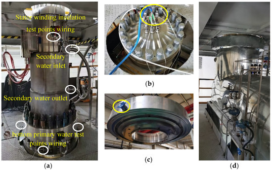 To obtain comprehensive performance, a multi-parameters test rig of the 0.24 MW shielding induction motor was established in the factory for the reactor coolant pump for small reactors, as shown in Figure 3. As previously mentioned, the water temperature for bearings lubricating and the insulation temperature were the key testing parameters for performance. Therefore, four temperature test points were installed in the lubricating water above the thrust bearing through the end cover considering that the water clearance was too narrow and the inconvenience of arrangement of the measuring holes and were called top primary cooling water test points for brevity. At the same time, the four test points were installed in the lower annular duct at 90° intervals along the circumferential direction under the lower position of the motor to monitor the water temperature of the lubricated lower guide bearing not exceeding the alarming temperature for real time, and they were called bottom primary cooling water test points (see Figure 1b). For the thermo-safety of stator winding insulation, a total of 6 temperature test points were embedded on the surface of the insulating material at the centers of the winding nose with the worst heat dissipation in the upper and lower end rooms of the stator winding based on previous research and experience, and this means that the insulation temperature measured can be taken as the peak temperature of the motor. Furthermore, two water temperature test points were also installed at the position of the inlet and outlet of secondary cooling water. The specific test point positions are shown in the circles in Figure 1 and Figure 3.